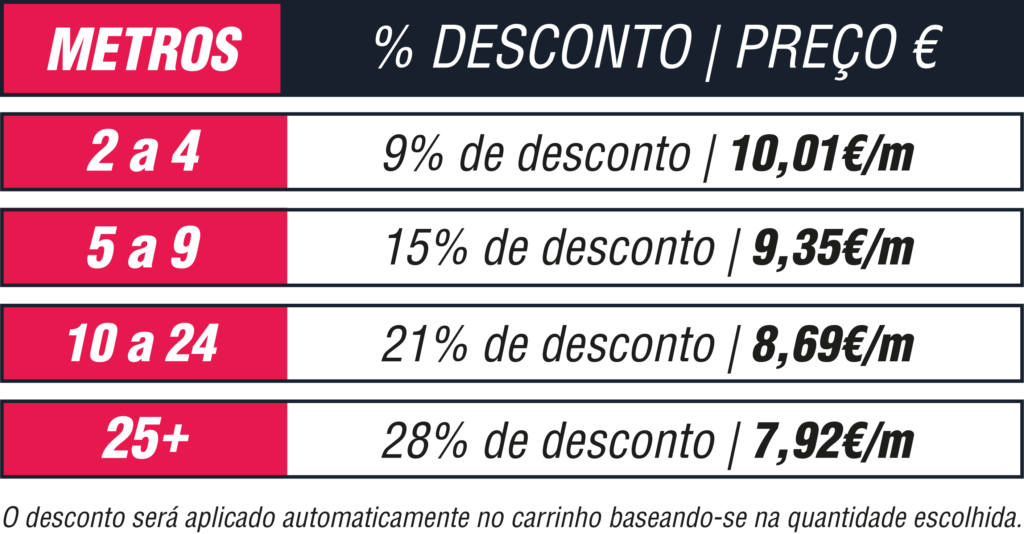 - Selecione a quantidade de metros desejada (o preço baixa automaticamente conforme o volume)